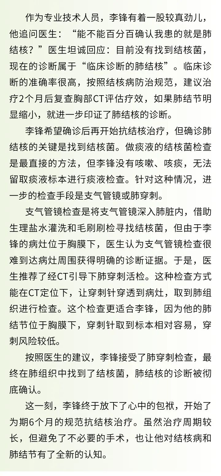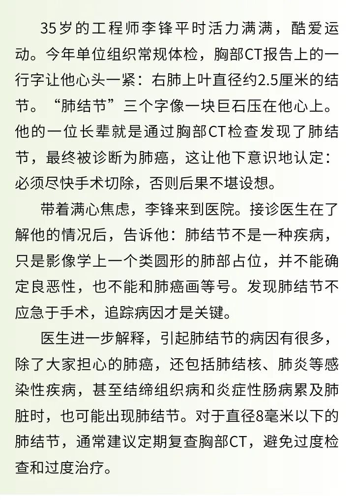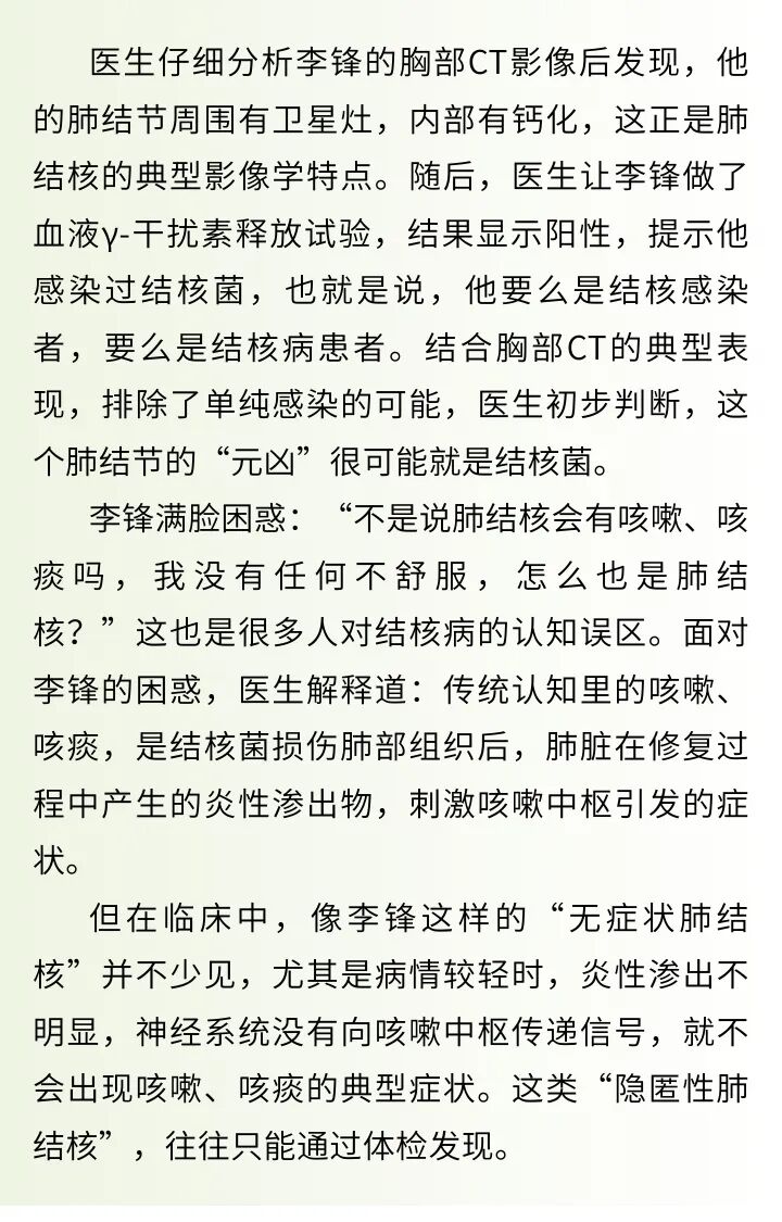 李锋的经历也给大家提了个醒:发现了肺结节,不必过度焦虑、急于手术;要警惕“无症状肺结核”的信号,主动参与体检,一旦发现肺部异常,及时寻求专业医生的帮助,遵循“早发现、早诊断、早治疗”的原则,更好地守护肺部健康。