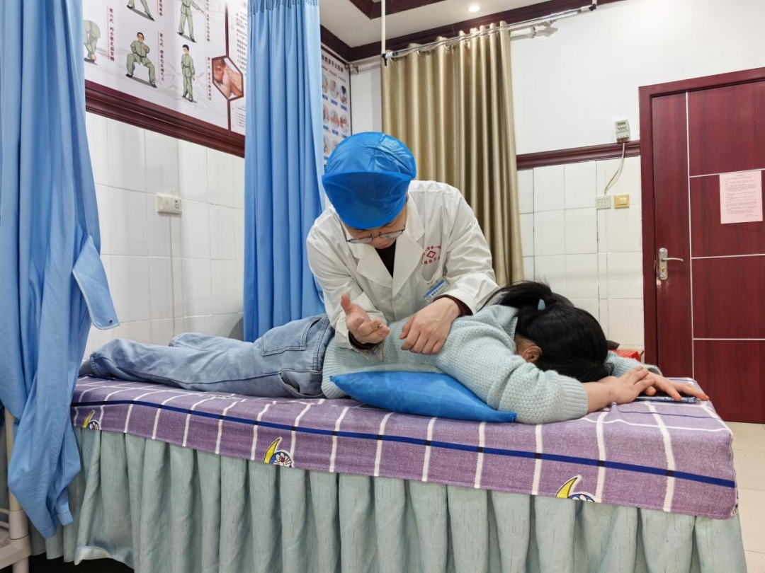 中医馆内,医师以专业的手法进行推拿,有效缓解患者腰部疼痛