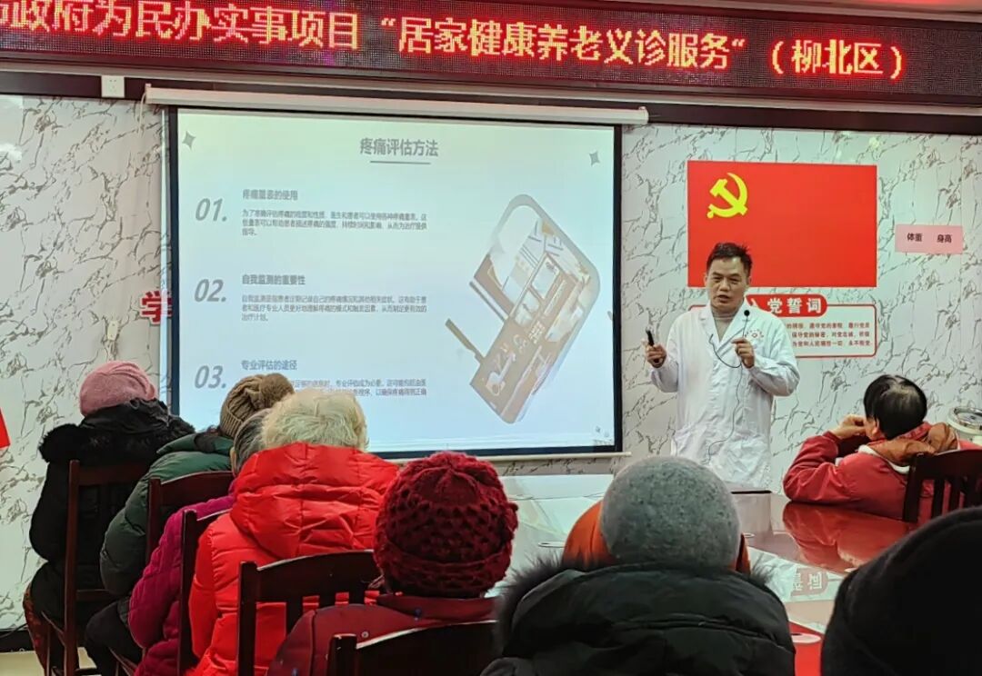 2月27日,开展居家健康养老义诊服务第一站在柳北区广跃社区正式启动。活动邀请了柳州市人民医院医疗集团8个科室共10位专家前来为老人服务。具体包括疼痛科、骨科、中医科、风湿免疫科、呼吸科等科室。三甲医院的医生来到社区,让居民在家门口就能享受到便捷、优质、全面的医疗卫生服务。当天上午9时许,50多名老人来到社区。考虑到天气寒冷,社区工作人员将活动场地搬到了室内。在活动中,医生给大家讲解了老年疼痛、中医治疗老年疾病以及春季养生等方面的知识,并免费为老人们进行骨密度、血压、血糖等方面的检测。老人还可以现场向医生进行健康咨询,了解自身的身体状况。现场的家庭医生团队为参加义诊的老人做好就诊记录,将纳入老年人健康管理档案,做好后续服务。