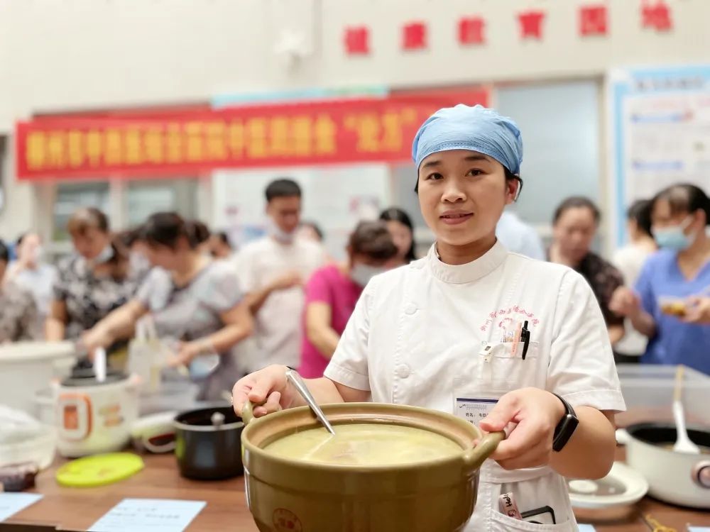 玉竹老鸭煲、茯苓炖土鸡、沙参麦冬汤……光看名字就能体会药膳在食品中作用。各个科室的医护人员化作药膳师,采用蒸、烹、煮、烧、炖、焖、熬等技法,以各种中草药,制作出汤料、甜点、炒菜等花式药膳美食,一共制作了60道自选菜品,当一道道精美的药膳被依次端上展示台时,大家都发出一阵阵惊呼声。