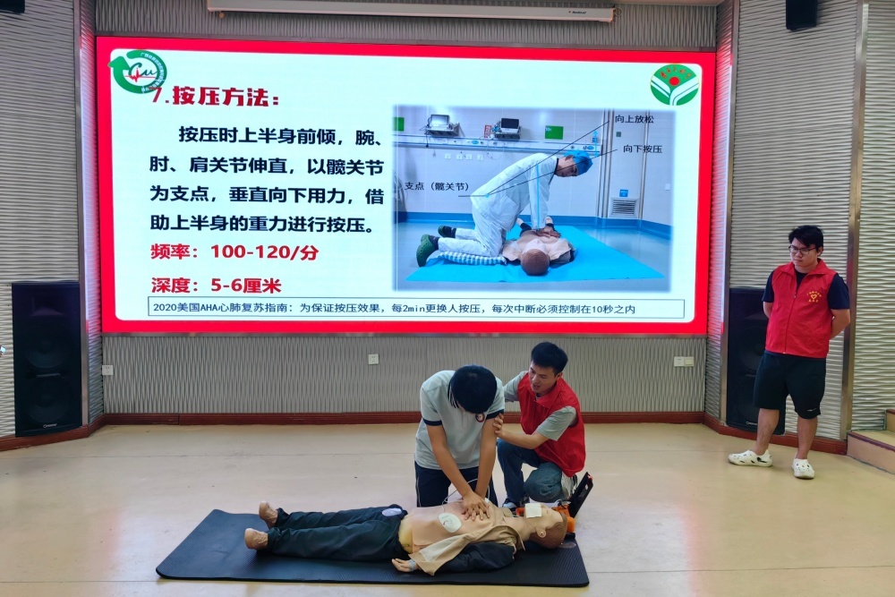 现场,号长蒙俊玮聚焦青少年日常安全需求,通过PPT演示、情景模拟等形式,结合身边具体的案例,向学生们介绍了心肺复苏的重要性以及“黄金四分钟”等关键概念。