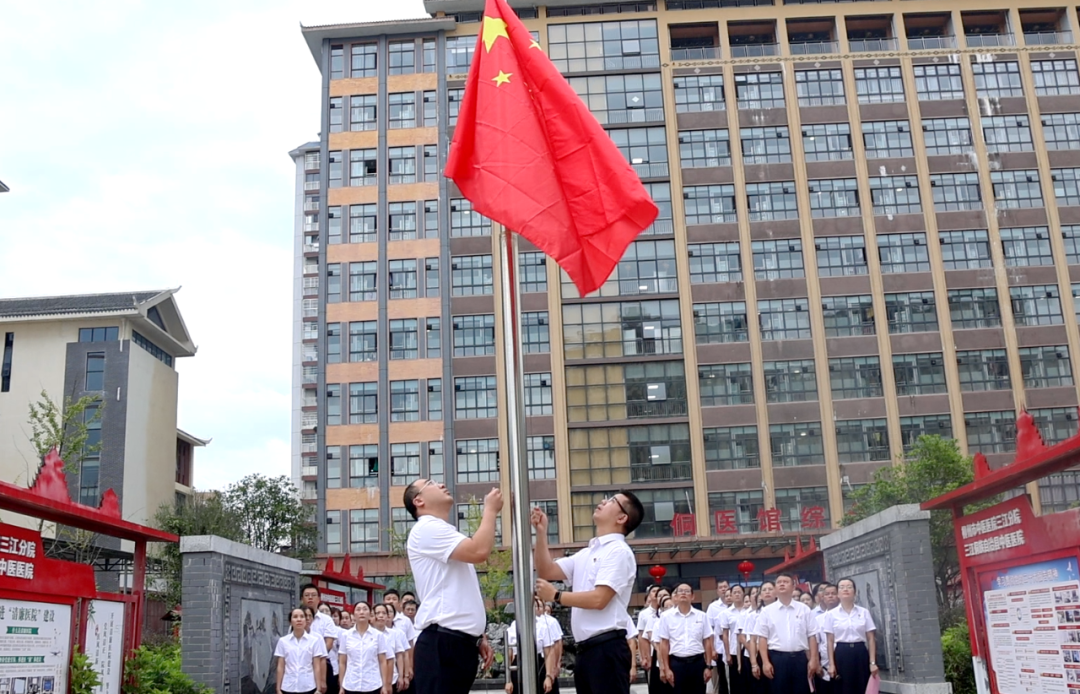 清晨的医院广场庄严肃穆,鲜艳的五星红旗在微风中静静矗立。我院党政班子、全体党员干部身着正装,佩戴党徽,整齐列队,面向国旗肃立。伴随着雄壮激昂的《义勇军进行曲》,护旗手迈着坚定有力的步伐走向旗杆,将五星红旗缓缓升起。当国旗迎风展开、冉冉升空的瞬间,全体人员肃立行注目礼,目光中满是对祖国的崇敬与热爱,嘹亮的歌声回荡在广场上空,汇聚成砥砺奋进的铿锵力量。