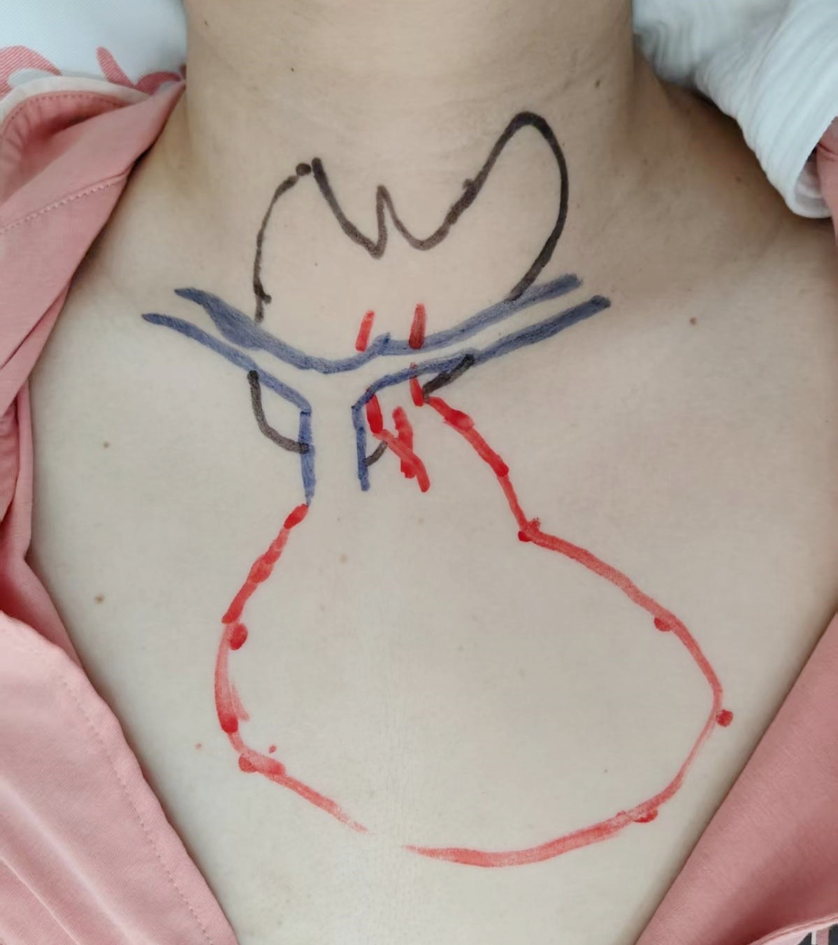 2025年9月,张女士因检查发现颈部甲状腺结节来到广西科技大学第二附属医院(柳州肿瘤医院)甲状腺外科一病区就诊。经科室完善相关检查后,发现张女士为胸骨后甲状腺肿瘤,向胸骨下方延伸约5CM,已压迫气管,需要马上进行手术。
