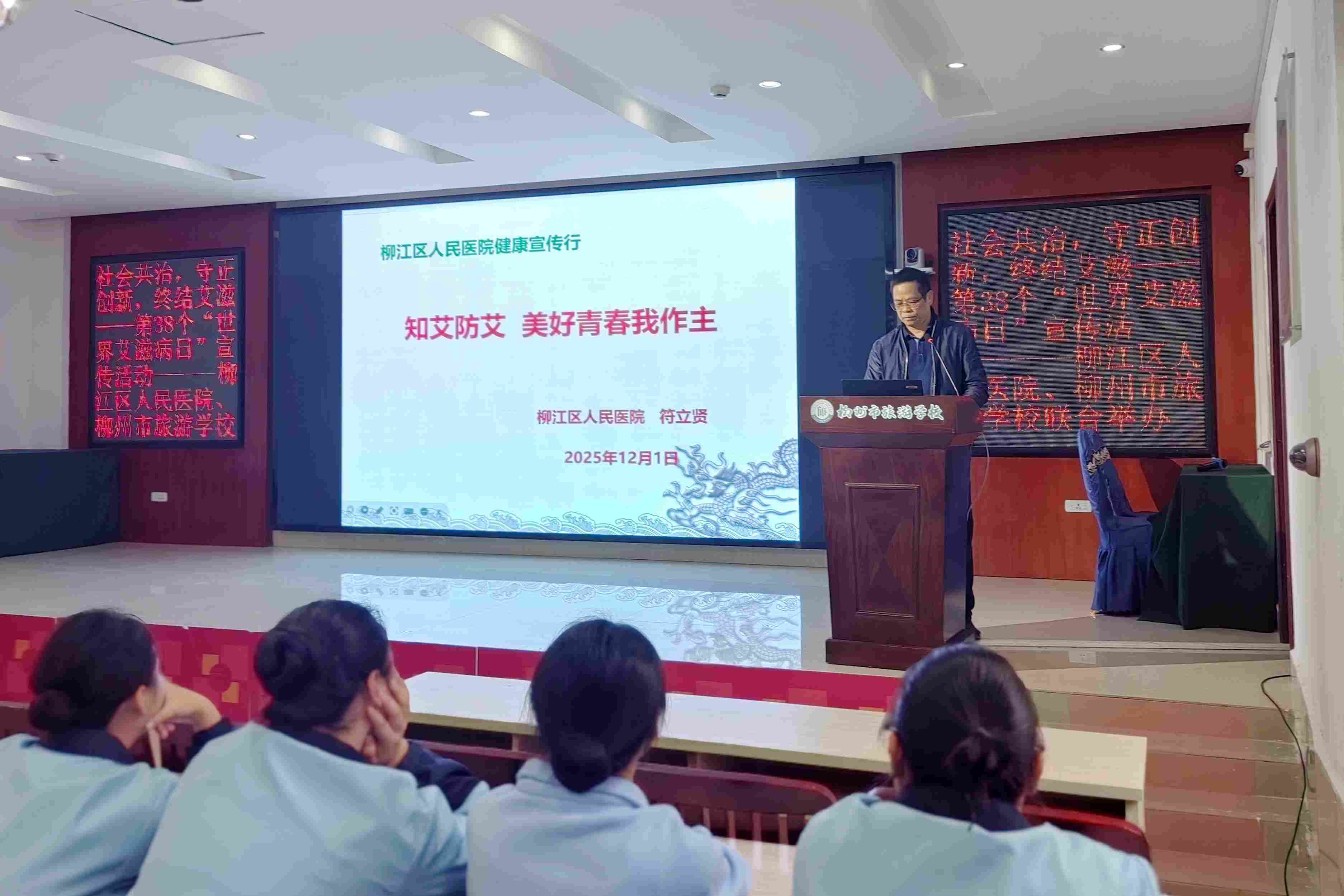 当天下午,柳江区人民医院还组织医护专家团队走进健康共建单位——柳州市旅游学校,开展健康讲座与HIV现场检测活动。感染性疾病科主任符立贤以《知艾防艾 美好青春我作主》为题,为在场学生系统讲解了艾滋病的传播途径、预防措施及相关健康知识。积极引导学生树立健康的恋爱观、婚姻观、家庭观和性观念,强调防患于未然的重要性,助力学生们在青春路上更好地保护自己、尊重他人。
