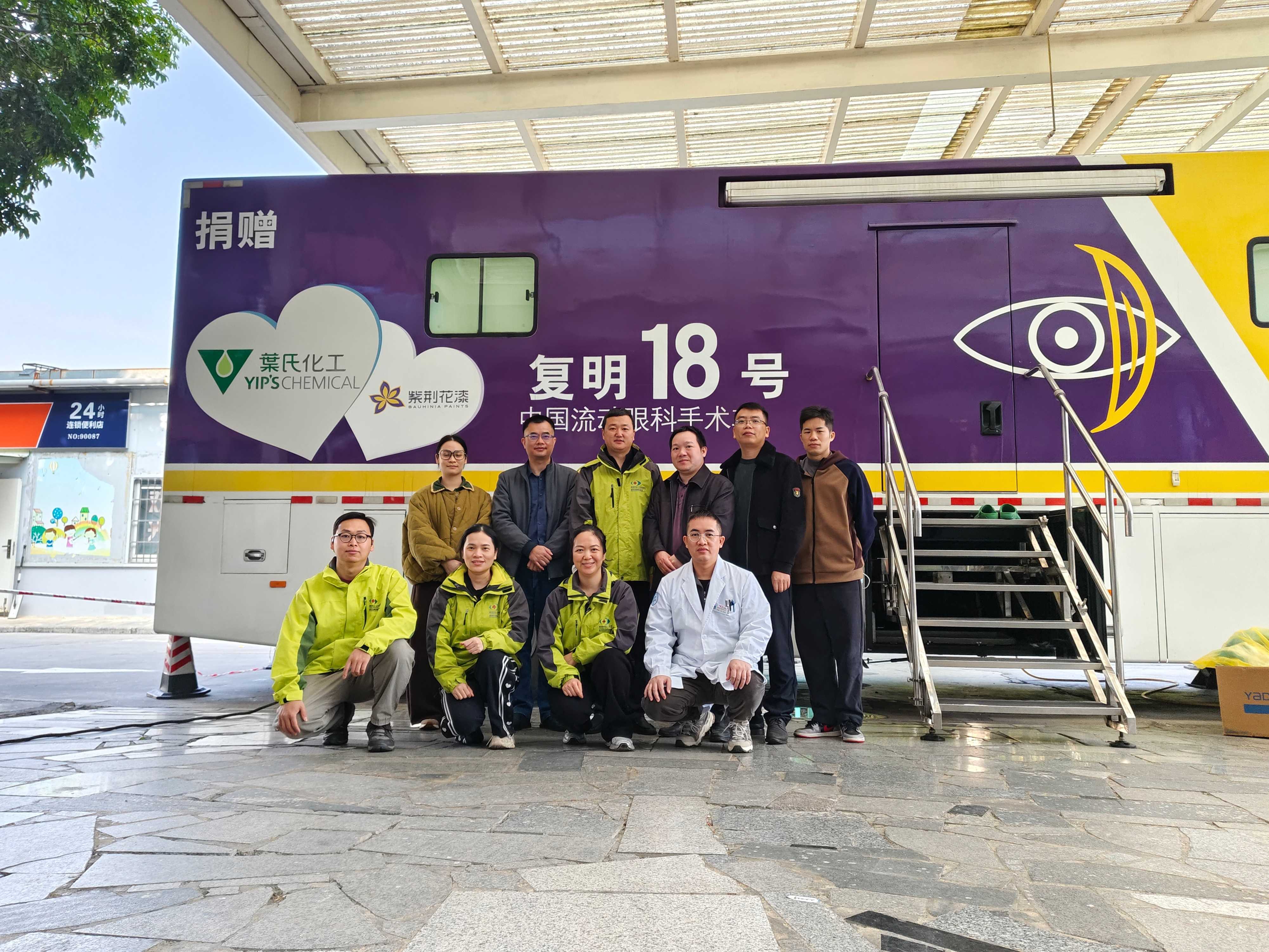 12月17日,在广州市妇女儿童医疗中心柳州医院的住院楼前,医疗队员们登上“复明18号”手术车,观摩我院眼底病与白内障病区韩光杰副主任为白内障患者实施复明手术。