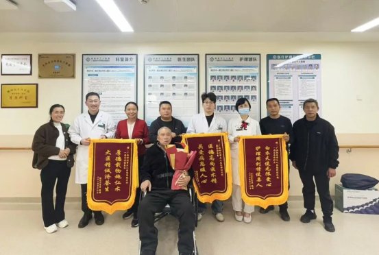 “是你们给了老人第二次生命,用医术和爱心救了我们全家!”出院前,家属特意定制了四面锦旗,分别赠予神经外科全体医生、护理团队及护工人员,以最真挚的方式,致敬这份厚重的恩情。