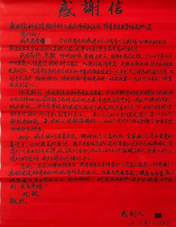 如今,刘老先生已顺利康复出院,精神状态日益向好,全家都沉浸在团圆的喜悦之中。这封红纸黑字的感谢信,不仅是患者的心声流露,更是医患情深的生动见证。未来,广西胸科医院全体医护人员将持续秉持这份专业初心,以更精湛的医术、更优质的服务,守护更多群众的生命健康。