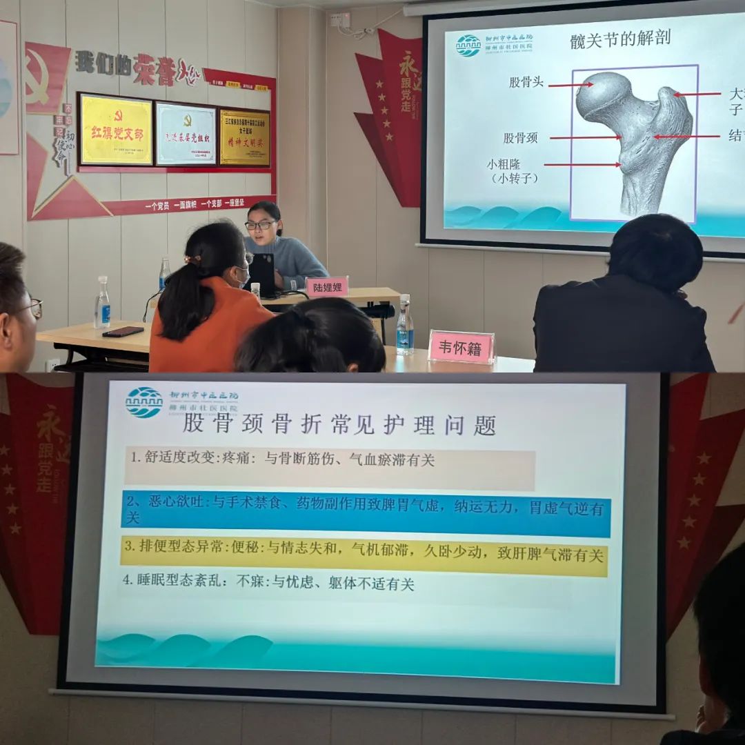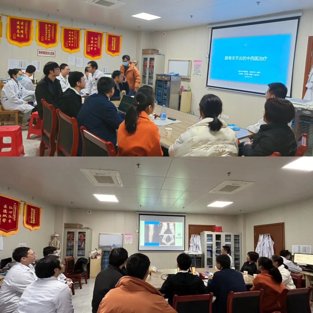 查房结束后,洪定钢教授为骨伤科医护人员进行授课 ,以《膝骨关节炎中西医治疗》为题,讲述了膝关节病临床特点、诱发因素、高发人群以及因人而异的治疗方法,并结合工作中的实际案例,详细讲解了中西医药物治疗、手术过程及优点,让在场的医务人员对膝骨关节炎病有了全新的认识。