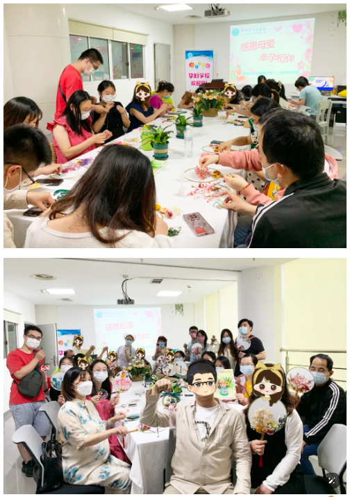 随着热烈的掌声响起,准妈妈、准爸爸开始了一场寓教于乐的手工活动,他们围坐在一起制作富含爱意及期待的花团扇、风铃。这不仅是一场奇妙的胎教,更是在母子合体的时候,留下的最珍贵的礼物。