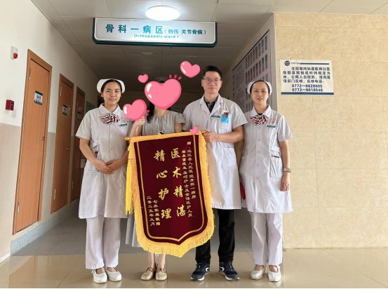 术后,骨科一病区护理团队精心护理,密切监测其生命体征与伤口恢复情况,指导其进行康复锻炼,助力其身体逐步康复。覃先生及家属对医护团队始终如一的专业、负责与关怀感念于心,康复后特意送来锦旗,以表谢意。