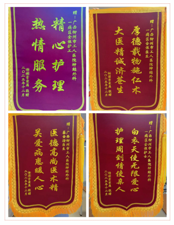今年12月,柳州市工人医院神经外科的医护人员与护工们,接连收到四面饱含深情的锦旗。锦旗上熠熠生辉的鎏金大字,不仅承载着患者杨老一家由衷的感谢,更记录下一段历时67天、医患同心共渡难关的温暖故事。